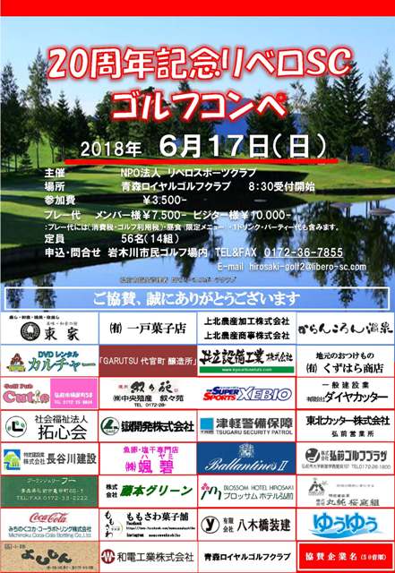 恒例のリベロSCゴルフコンペを青森ロイヤルゴルフクラブを会場に開催いたします。今回は20周年記念大会として、様々な賞を企画して開催いたしますのでゴルフ好きの皆様のご参加お待ちしております。