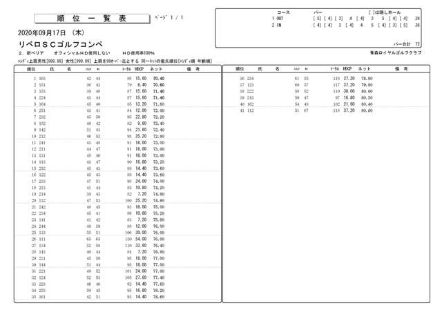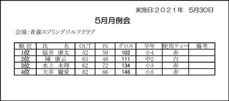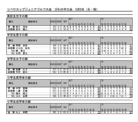 リベロカップジュニアゴルフ大会 青森ロイヤル大会 成績表
